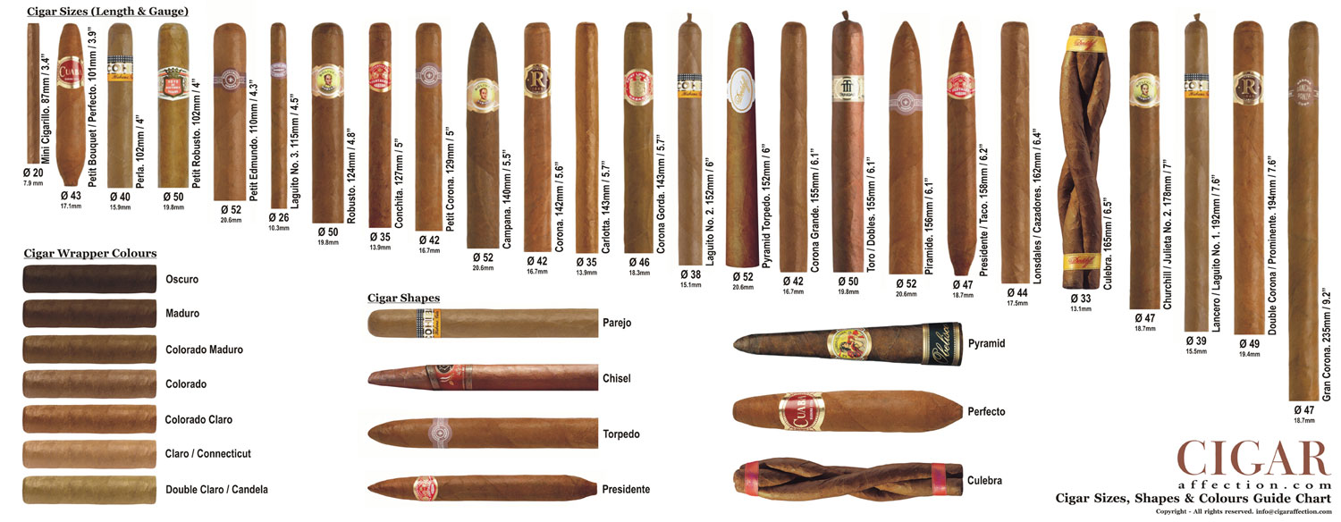 Velice podrobný přehled různých typů, velikostí a tvarů doutníků naleznete na stránkách cigarafection.com