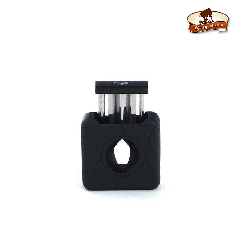Kovový ořezávač na doutníky Angelo s vyštípávačem a jehlou. Jednobřitý doutníkový ořezávač s V-Cut ořezem do tvaru V má povrch v černém matném provedení s jemnou texturou. Oříznutí doutníku do tvaru V se opět stává populárním, jelikož takový ořez může zlepšit nejen tah doutníku, ale především změnit - zlepšit chuť při jeho kouření. Hloubka V-Cutu může být až 7 mm. Kvalitně zpracovaný ořezávač gilotinového typu je vybavený ostrým břitem z kvalitní oceli, který garantuje perfektní řez. Stisknutím horního tlačítka se ořezávač "odjistí" a je připravený k použití. Na pravé straně najdeme výklopný vyštípávač, na druhé je zasunut trn (jehla) pro zlepšení tahu doutníku. Doutníkový ořezávač je dodáván krabičce.